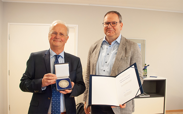 Der Vorstand der Ärztekammer M-V hat Prof. Dr. med. habil. Hermann Dittrich am 4. Februar 2026 mit der „Ernst-von-Bergmann“-Medaille der Bundesärztekammer ausgezeichnet. Prof. Dr. Dittrich hat sich in herausragender Weise um die ärztliche Fortbildung in Mecklenburg-Vorpommern verdient gemacht. Von 2019 bis 2022 engagierte er sich ehrenamtlich im Projekt „IQmed MV“ als wissenschaftlicher Leiter für das Fachmodul Chirurgie sowie als Dozent in Chirurgie und Notfallmedizin. Dabei bereitete er in über 100 Kursstunden insgesamt 210 internationale Ärztinnen und Ärzte auf Kenntnisprüfungen vor und entwickelte zusätzlich umfangreiche E-Learning-Inhalte. Nach dem Ende der Projektförderung unterstützte Prof. Dr. Dittrich maßgeblich die Etablierung des Vorbereitungskurses als reguläre Fortbildung der Ärztekammer M-V. Seit 2023 ist er weiterhin als wissenschaftlicher Leiter und Honorardozent tätig. Darüber hinaus ist Prof. Dr. Dittrich seit 2018 als Prüfer für Fachsprachen- und Kenntnisprüfungen tätig und seit 2019 Vorsitzender der Kommission für Kenntnisprüfungen mit rund 150 Prüfungen pro Jahr.