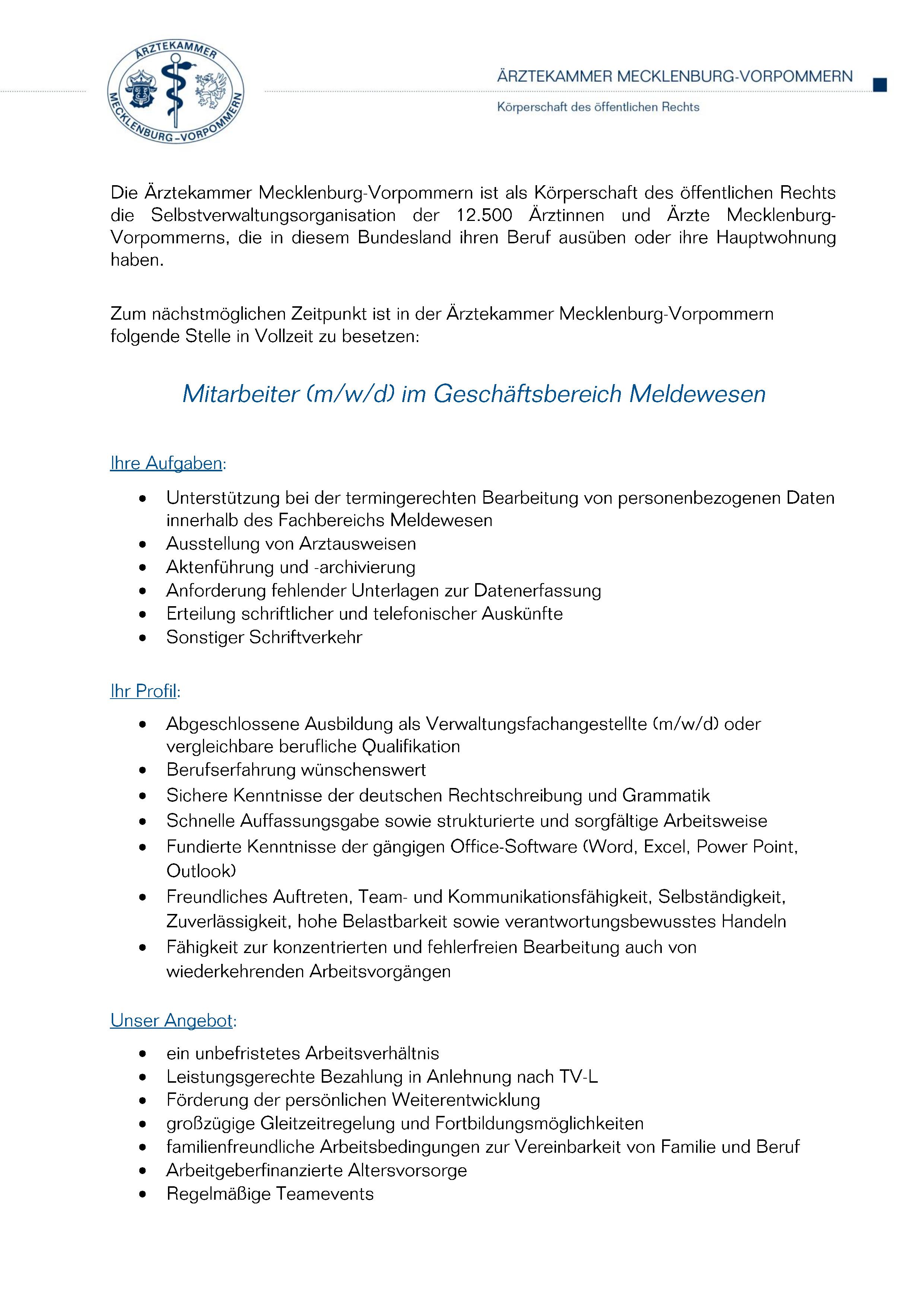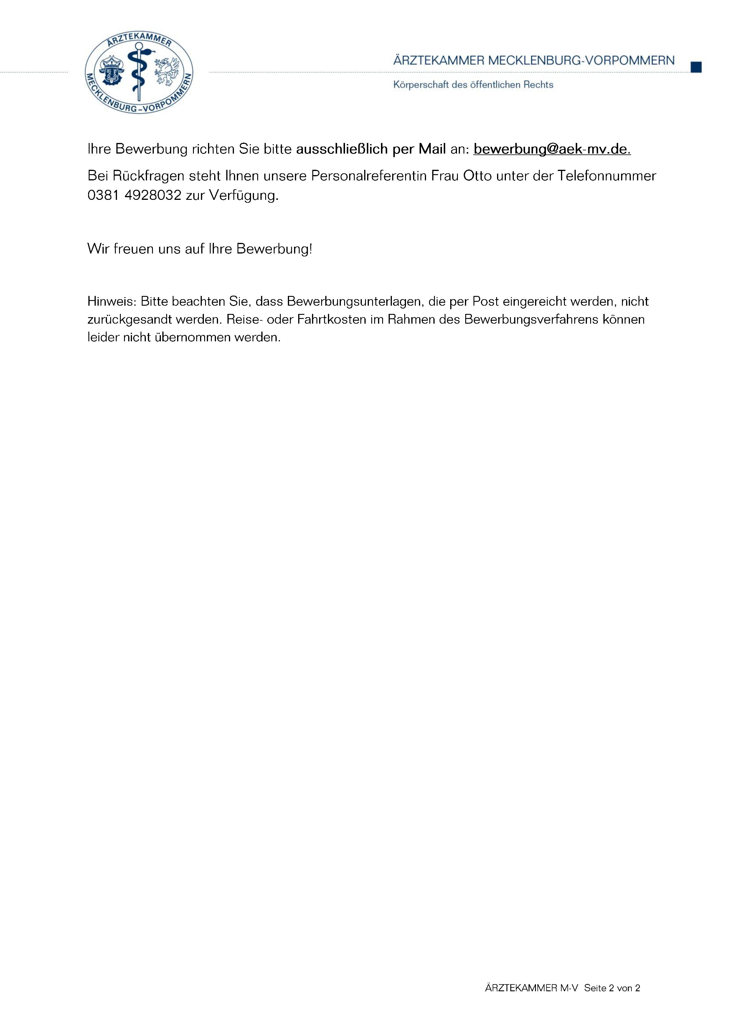 Bitte senden Sie Ihre Bewerbungsunterlagen ausschließlich per E-Mail an: bewerbung@aek-mv.de.